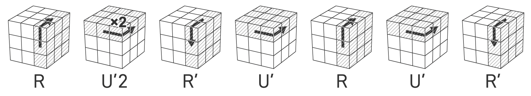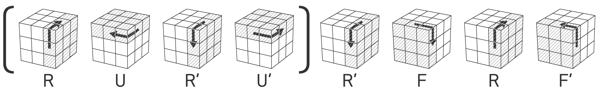 총 10회전으로 노란색 면을 다 맞출 수 있습니다. 트위스트 공식이 두 번 사용된다는 것을 기억하세요.
