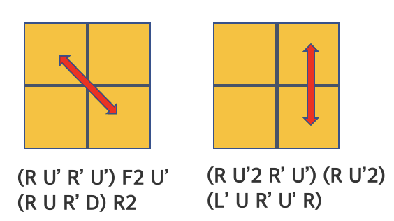 1층 하얀 면을 다 맞추었다는 가정하에 윗면 노란색 면을 상황에 따라 한 번에 맞추는 공식입니다.