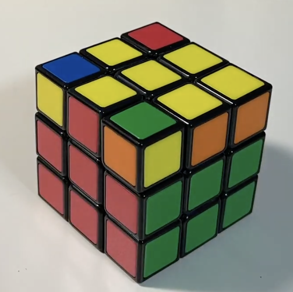 잘 보면 노랑색 면을 맞추고 면에 인접한 빨간색과 녹색면 1층까지 맞춘 것을 볼 수 있습니다.